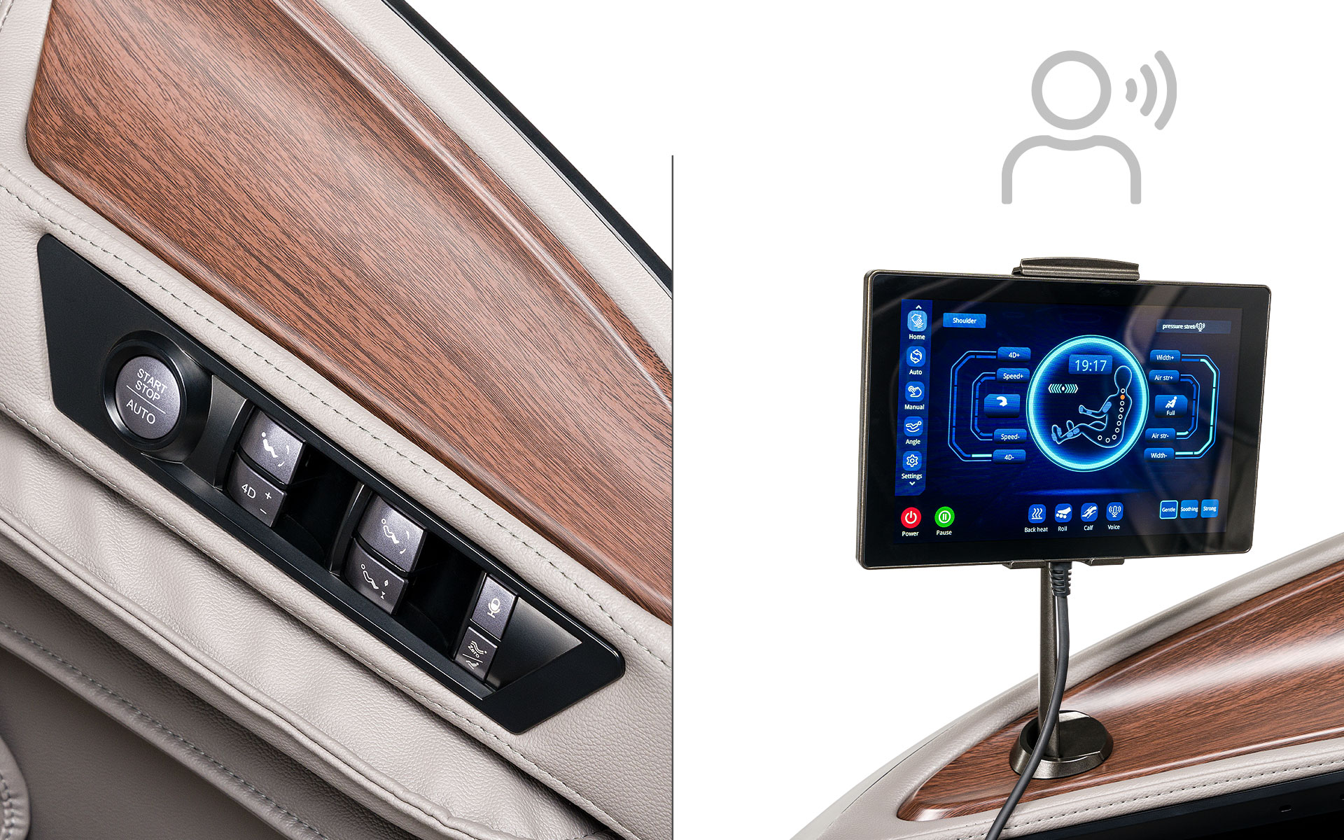 Ďalšie funkcie: | ovládací panel, mechanická masáž lýtok + jeden chrbtový valček, detekcia zdravia, Zero Wall, Bluetooth reproduktory, držiak na telefón s nabíjačkou, USB nabíjačka, hlasové ovládanie, 2 pamäte osobných nastavení |