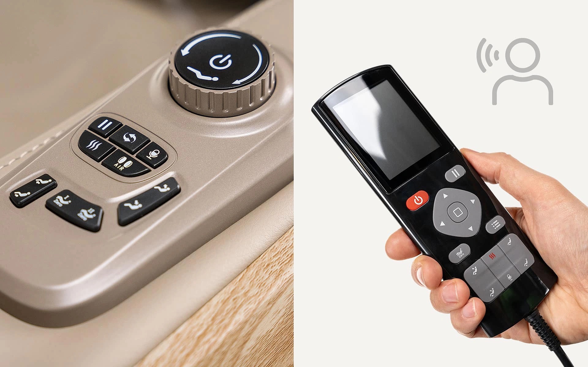 Masážne kreslo sa ovláda 3 spôsobmi: mimoriadne intuitívnym diaľkovým ovládačom , praktickým ovládacím panelom zabudovaným v pravej lakťovej opierke alebo hlasovými povelami v angličtine.